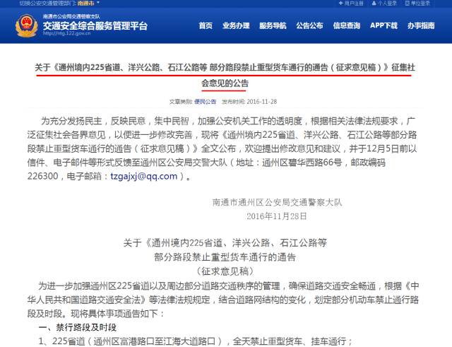 为充分发扬民主,反映民意,集中民智,加强公安机关工作的透明度,根据相关法律法规要求,广泛征集社会各界意见,以便进一步修改完善,现将《通州境内225省道、洋兴公路、石江公路等部分路段禁止重型货车通行的通告(征求意见稿)》全文公布,欢迎提出修改意见和建议,并于12月5日前以信件、电子邮件等形式反馈至通州区公安局交警大队(地址:通州区碧华西路66号,邮政编码226300,电子邮箱:tzgajxj@qq.com)。
