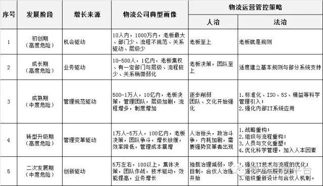 从我们的观察与实践结果显示,运营是物流的核心,是物流公司持续稳健增长的基础,在不同的发展阶段要采取不同的运营管控策略,总体上要采用法治为先,人治辅佐的混合管理策略,见如下图: